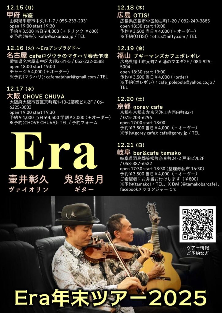 毎年恒例になりつつある Era の年末ツアー。今年も西へ向かいます! 各地の皆様とお会いできるのを楽しみにしております。